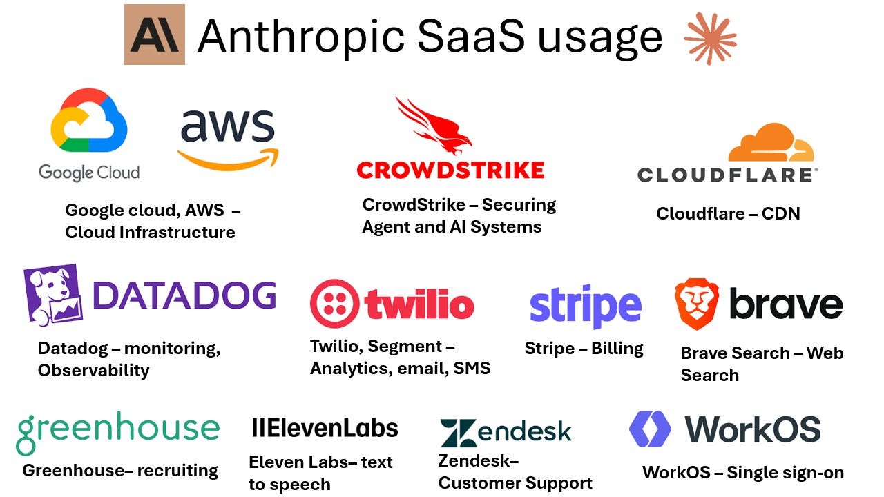 Let’s take a look at Anthropic first. The company that is helping write the code is using quite a lot of SaaS companies in its product technology stack and operations. Just to name a few: CrowdStrike for securing agents, MCP servers, and other AI systems; Datadog for observability; Cloudflare for traffic routing (CDN); Stripe for billing; Greenhouse for recruiting. You can see that in the image below.