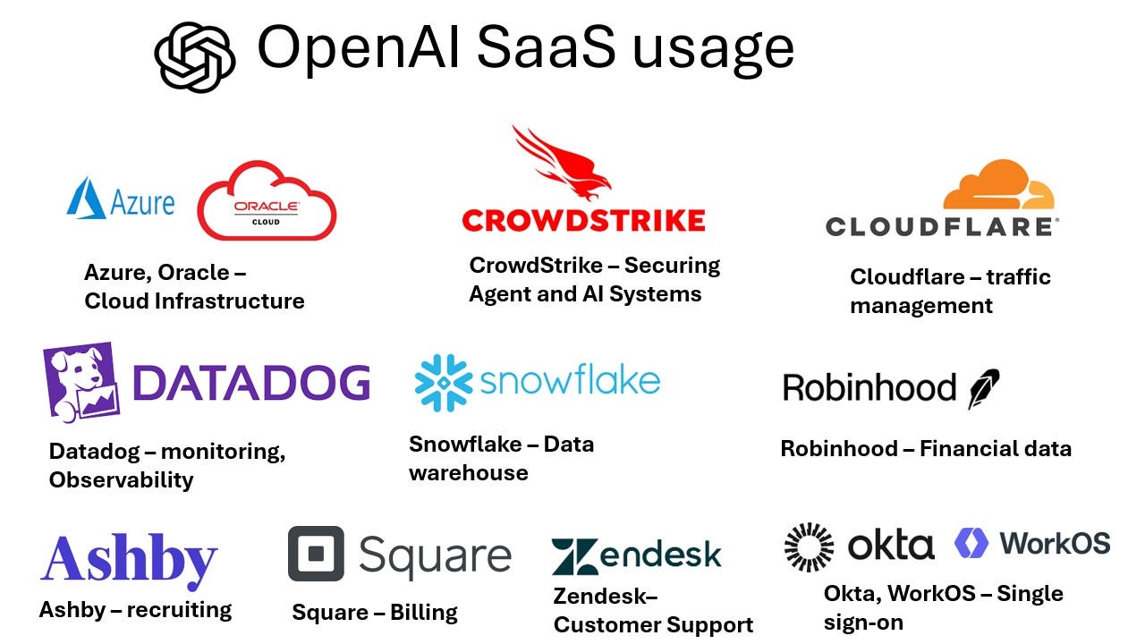 Let’s look at OpenAI. The company is building models for generating images, videos, code, and also for general knowledge. I see a similar pattern to Anthropic; OpenAI is also using other SaaS companies in its product technology stack and operations. Just to name a few: CrowdStrike for securing agents, and other AI systems; Datadog for observability; Cloudflare for traffic management; Snowflake for Data warehouse, Square for billing. You can see that in the image below.